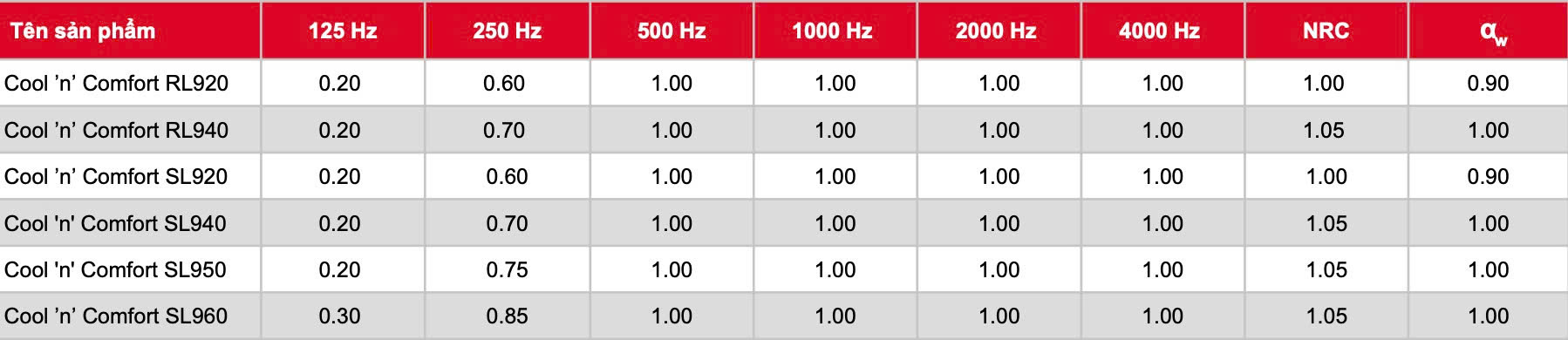 Hệ số hấp thụ âm thanh ở các dải tần số Oactive khác nhau (Độ dày 50mm)