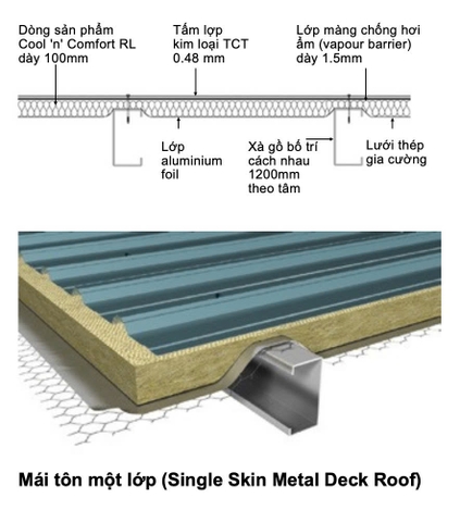 Đối với hệ mái kim loại một lớp, vật liệu cách nhiệt được lắp đặt bên dưới tấm lợp kim loại, cố định bằng lưới thép gia cường và lớp phủ lá nhôm cuộn trên xà gồ. Đây là giải pháp kinh tế và phổ biến cho phần lớn các công trình công nghiệp. Trong hệ thống này, ROCKWOOL Cool ‘n’ Comfort RL là giải pháp cách nhiệt nhẹ, không cháy, phù hợp và hiệu quả.