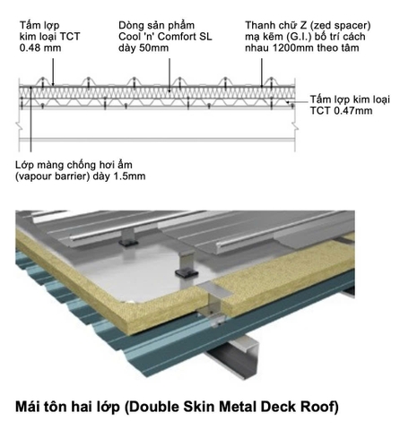 Hệ mái kim loại hai lớp là hệ mái hiệu suất cao, bao gồm một tấm kim loại phía trên (dạng hình thang hoặc đường may đứng) và một khay kim loại hình thang phía dưới. Hai lớp kim loại được liên kết với nhau bằng xà gồ chữ Z, tạo ra khoảng trống để lắp đặt vật liệu cách nhiệt và lớp chắn hơi. Khi kết hợp với vật liệu cách nhiệt len đá Cool ‘n’ Comfort dòng SL, hệ mái hai lớp được nâng cao đáng kể về khả năng cách nhiệt, cách âm và an toàn chống cháy.