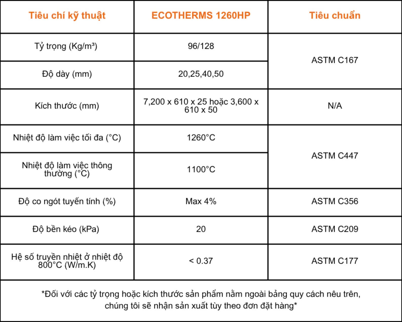 Khả năng cách nhiệt vượt trội: Bông gốm ECOTHERMS 1260 HP có hệ số dẫn nhiệt thấp, giúp hạn chế tối đa sự truyền nhiệt và mang lại hiệu quả cách nhiệt cao trong môi trường nhiệt độ lớn.